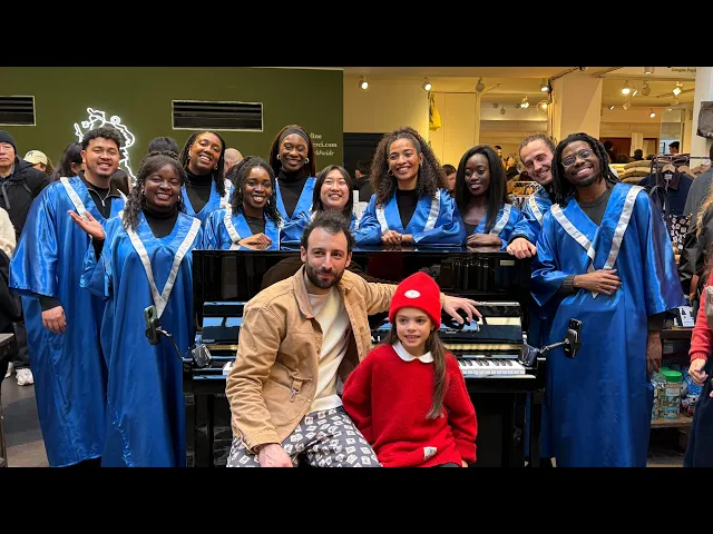 Julien Cohen organise un flashmob épique en invitant Maya ( une pianiste prodige de 6 ans ), des violonistes, la chanteuse américaine Jewels Gold et notre chorale pour animer la boutique Le Vieux Campeur en collaboration avec Merci Paris